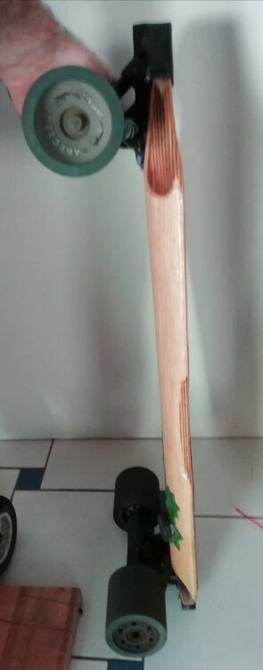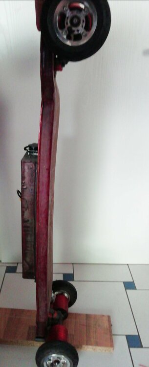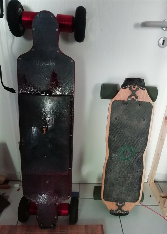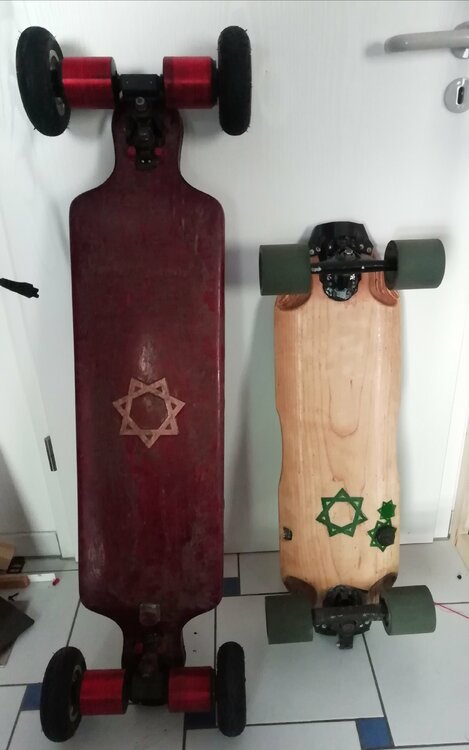 Hallo zusammen, ich fand die Idee schön einfach mal so seinen Fuhrpark vorzustellen, da bekommt jede/r mal einen Eindruck von dem was die/der andere schon so gefahren ist und zustande bekommen hat, ohne dass es direkt ein Build-Thread sein muss Das hier sind meine beiden, Blutstern und Grünstern (Hab mir die Namen für ein englischsprachiges Forum ausgesucht, wer mehr Infos möchte einfach nach den beiden Namen googlen) Das Kleine ist ein MOV-E Shortboard mit Hummie Hubs und 12s4p VTC6 Akku (Details in einem anderen Thread hier) und das große ein Rocket Deck mit 4WD eLofty DirectDrives und Bergmeister Wheels mit Strom von 10s6p VTC6 on Board. In dem gerade fertiggestellten Expansion Pack für das Rote ist nochmal ein 10s3p 40T Akku der parallel oder einzeln geschaltet werden kann. Beides sind integrierte Decks, bin ein sehr großer Fan von dieser Art Deck mit Enclosure, mein erstes "Richtiges" Projekt war etwas ähnliches aber Selbstgebasteltes. Demnächst bekomme ich eine verbesserte Version der Loaded hubs mit denen ich dann mein neustes Projekt antreibe, ein 35 Zoll Bustin YoFace. Hier habe ich das Ziel, ein möglichst skatebares Gefährt zu erhalten, der Akku soll möglichst leicht sein und flach. Dafür habe ich bereits 10 einzelne Lipo-Zellen hier liegen, sobald ich die Hubs habe wird alles ausbalanciert und dann gehts ans Case-Design. Denke hierzu mache ich dann mal einen Bauthread um hier mal wieder ein bisschen Leben in die Bude zu bringen. Bin gespannt was noch so kommt. Ein ähnlicher Thread wurde schonmal vor längerer Zeit gestartet und einfach niedergebrüllt, mal sehen was di Zukunft so bringt 😉