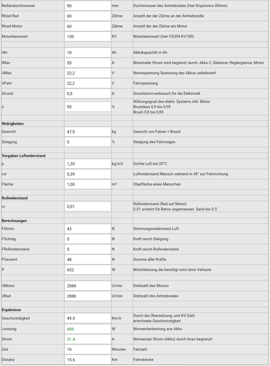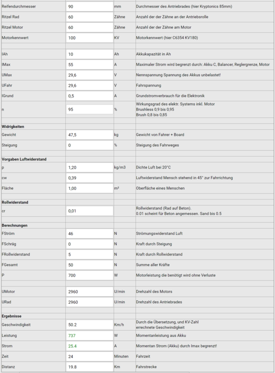 Setup-Up für Dual Hubmotor (6S-130kV vs. 8S-100kV)Steinie_v2 hat ein Thema erstellt in: Eigenbauten Hallo Freunde des elektrischen Boardsports! Nachdem ich jetzt viele Jahre mit meinem selbst gebastelten E-Board mit einem Motor und Riementrieb gefahren bin, habe ich während der letzten vielen Wochen voller Freizeit endlich mein neues Projekt angefangen: Ein komplett neues Board mit 2 Hubmotoren. Aktuell fahre ich einen APS6355 mit 190kV an 8S und 18/36 Zähne (83mm Rollen), sodass ich mit rund 5,8Nm und 40km/h Spitze unterwegs bin. Damit war ich soweit immer sehr zufrieden, aber bigger ist ja bekanntlich immer better 😉 Das neue soll 50 km/h schaffen und noch etwas mehr Druck beim Beschleunigen machen. Daher die Frage, welche Variante an Hubmotoren? Für den Reichweitenrechner habe ich die Kräfte halbiert, um den Betrieb mit 2 Motoren zu "simulieren". Das Ergebnis: Variante 1 (6S, 130kV, 55A) 2 von diesen Motoren würden zusammen rund 8,2Nm auf die Straße bringen. Variante 2 (8S, 100kV, 55A) 2 von diesen Motoren würden zusammen rund 10,7Nm auf die Straße bringen. Jetzt klingt Variante 2 natürlich schon viel geiler aber 8S heißt beim Thema Akku natürlich auch mehr Geld und mehr Gewicht... Der Reichweitenunterschied ist mir nicht so wichtig. Was sagt eure Erfahrung, machen beide Setups Sinn für ein reines Streetboard? Welches würdet ihr bevorzugen? Viele Grüße