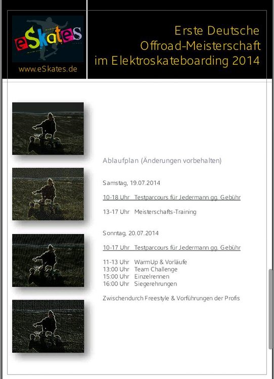 Allgemein findet ihr unter folgendem Link wichtige Informationen, wie Kai schon schrieb: Die Anmeldung zur Meisterschaft. Außerdem ein Factsheet und den Pressetext. - http://www.eskates.de/deutsche-elektro-skateboard-meisterschaften/2-deutsche-indoor-elektro-skateboard-meisterschaft/ - Wir, das gesamte Team von eSkates und alle Beteiligten, freuen uns riesig auf euer erscheinen. Die Veranstaltung wird ein Mega Event, bei dem es ohne Ende Spaß gibt. Das wird der Hammer ! Beste Grüße und bis dann, Theo - eSkates