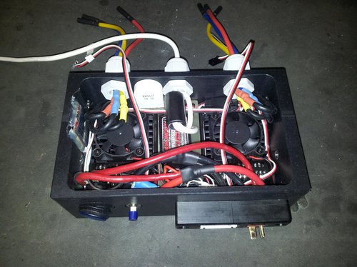 Nach dem ich jetzt 1,5 Monaten auf das Paket vom China man gewartet habe. :mad: (davon 4 Wochen in Wien am Zollamt) Konnte ich heute die Controllerbox fertig bauen. Betrieben wird das ganze mit je 2x 8s 5800mAh. geht maximal bis 10s Gruß Gerald