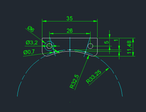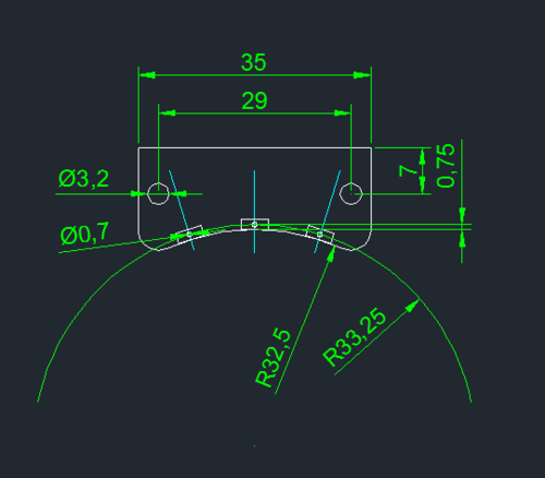 Die erste Zeichnung stimmt nicht. Die 32.004 müssten 32.5 sein R32.5 = 65mm Durchmesser = 65mm - 63mm = 2mm Durchmesser/2 = 1mm Radius Also 1mm Abstand zu einem 63mm Durchmesser. Wenn deine Sensorlöcher zu meiner DXF Datei passt. Dann stimmen auch die Winkel. Willst du mehr Fleisch zwischen Bohrung Sensor und Platinenrand?