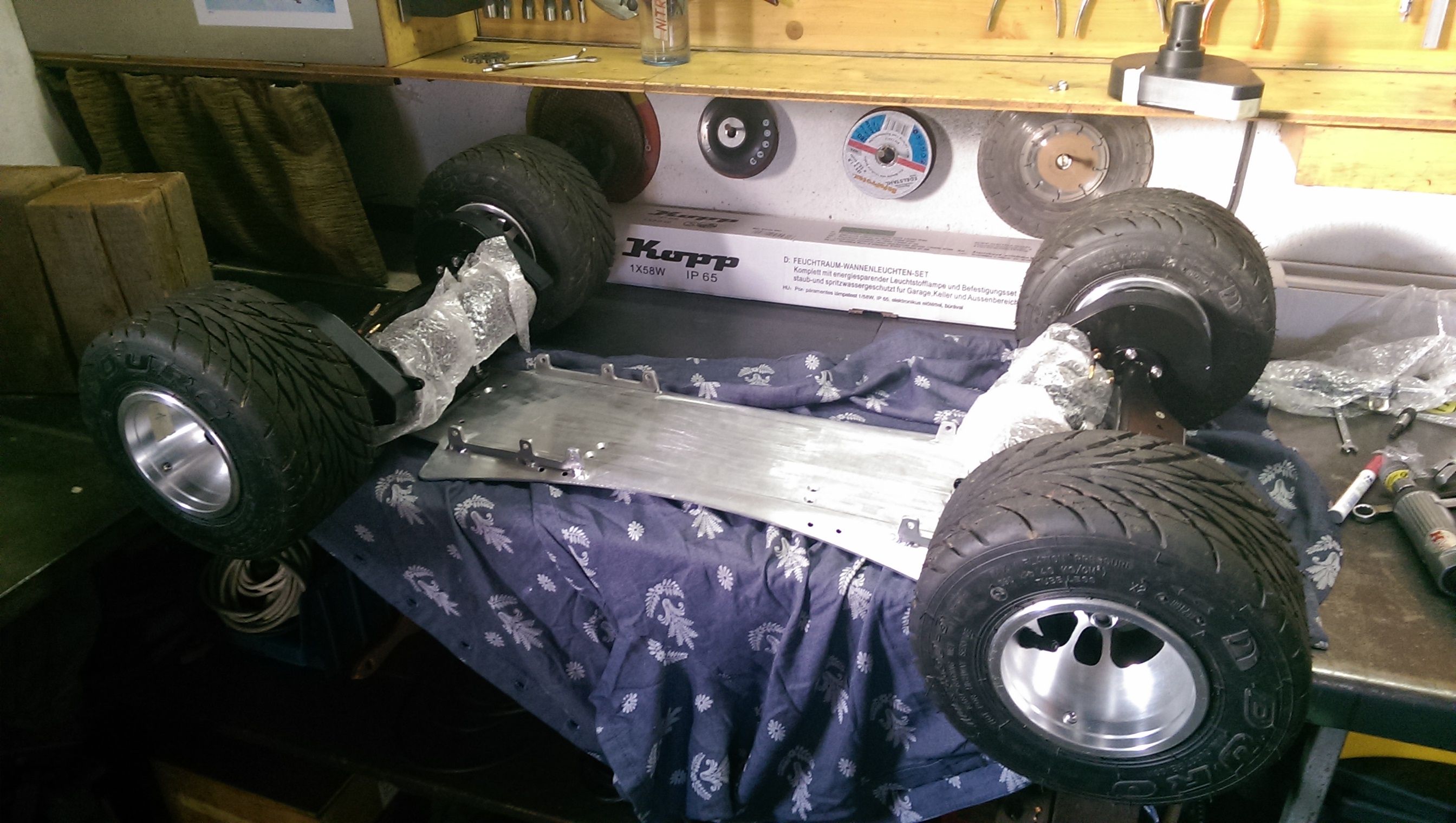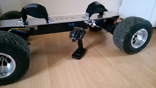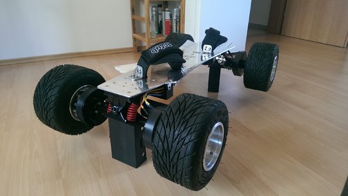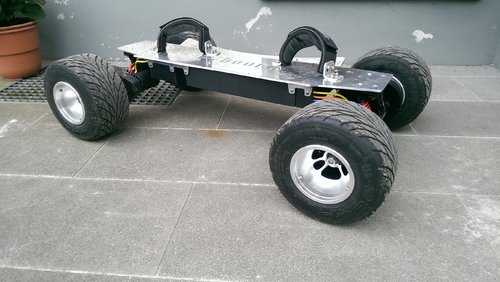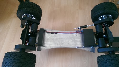 Ja das stimmt die Motoren haben auf der Rückseite eine Abdeckung. Einfluss auf die Motortemperatur hat das aber nicht wirklich. Ich hab da schon einiges probiert. Dazu gehörte auch ein Lüfterad, Aluminium Kühlkörper.... Abdeckung muss sein da ich nicht nur Staub in den Motoren hatte sonder auch kleine steine die dann zwischen Magneten und Wicklung zermalen wurden. Zwei von den C6374 habe ich durch Überlastung schon vernichtet. Das board läuft mit 45km/h noch sehr stabil. Die Mobo Achsen habe ich etwas bearbeitet. Achswinkel wurde verändert. Den Rest macht der Lenkgungstämper und die fein gewuchteten Räder. Ich kann es einfach nicht verkraften wenn ich nicht einmal einen 40km/h schnellen Traktor verfolgen kann. Deshalb 45km/h. Gruß Gerald