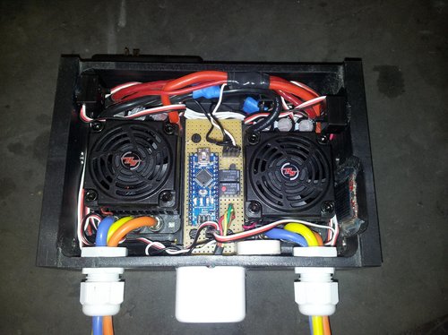 Danke Barney für die schnelle und hilfreiche Antwort. Den Regler habe ich nach dem einbau des Arduino Board neu angelernt. Im trockenen funktioniert ja auch alles perfekt. Aber wahrscheinlich wird es an dem zu sanften Anlauf liegen mit dem der Regler beim bergauf wegfahren überfordert ist. Die Stromversorgung über den externen BEC hat 5,1 Volt. Zum probieren ob es etwas ändern würde wenn ich den Strom vom Regler nähme fällt flach weil da 6 Volt rauskommen. Um die direkte Ansteuerung zu benutzen habe ich den Quellcode der gesamten Motorsteuerung herausgelöscht und den neuen hier im Forum geschriebenen hineinkopiert. Leider geht jetzt nur mehr die Bremse. Keine Reaktion auf vollgas. Version zwei mit den zwei Zeilen austauschen hat auch nicht funktioniert. Hier ein Bild von meinem Werk. Gruß Gerald