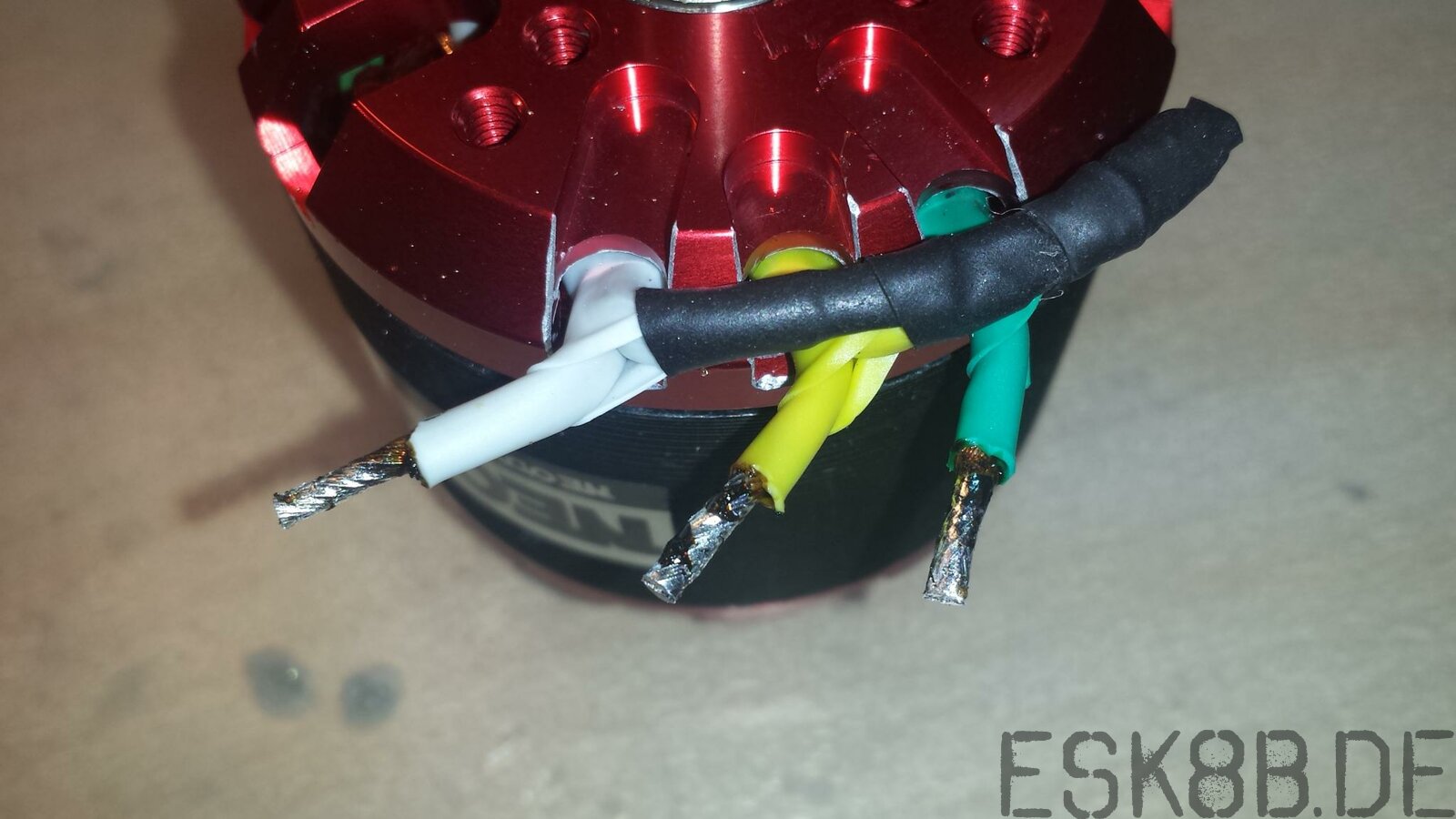 Duffman Geschrieben 1. September 2016 Autor Geschrieben 1. September 2016 (bearbeitet) Da ich möglichst leicht bauen wollte und die 6374 Motoren wieder mal nicht lieferbar waren, hab ich mich fĂŒr c6364 Motoren mit 245kv entschieden. Diese sind mit 64mm GehĂ€uselĂ€nge!! und 630g deutlich kompakter und leichter.    Um die mechanische Ăbersetzung auf brauchbare 1:6 zu bringen musste ich die Motoren mal wieder von Dreieck auf Stern umklemmen und somit die kv auf 140 reduzieren. Leider lĂ€sst sich bei diesen Motoren der Stator nicht vom GehĂ€use trennen. Somit musste ich die Wicklungen wieder unter etwas beengten VerhĂ€ltnissen separieren und neu zuordnen.     Wenn man auf eine widerspenstige Wicklungsisolierung trifft kann man diese durch ausglĂŒhen, anschleifen, Lötwasser und Flussmittel dennoch dazu ĂŒberreden sich sauber löten zu lassen. Bei diesen Motoren ist das allerdings unnötig, da sich die Wicklung auch direkt mit Lötkolben und Lötzinn löten lĂ€sst.    Hallsensoren waren von Angang an eingeplant und wurden mit Hilfe von Barneys TrĂ€gerplatine und 3D gedruckten GehĂ€useteilen auf den Motorhalteplatten angebracht. Die Platine mit den Sensoren steckt passgenau im GehĂ€usedeckel, der wiederum auf das seitlich verstellbare GehĂ€use geschraubt ist. Gleichzeitig dient das GehĂ€use als KabelfĂŒhrung fĂŒr die Motorkabel.   Gleich gehts weiter... bearbeitet 1. September 2016 von Duffman 3 Zitieren